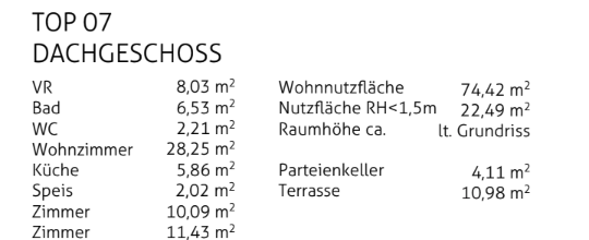 TOP 07 (Haus D, DG) mit ca. 74,42 m² Wohnnutzfläche: Wohnzimmer, separate Küche, 2 Zimmer, Bad, separates WC, Speis und Vorraum. Terrasse ca. 10,98 m². Zusätzlich Parteienkeller ca. 4,11 m². Raumhöhe ca. 2,70 m (Bad/WC ca. 2,85 m).