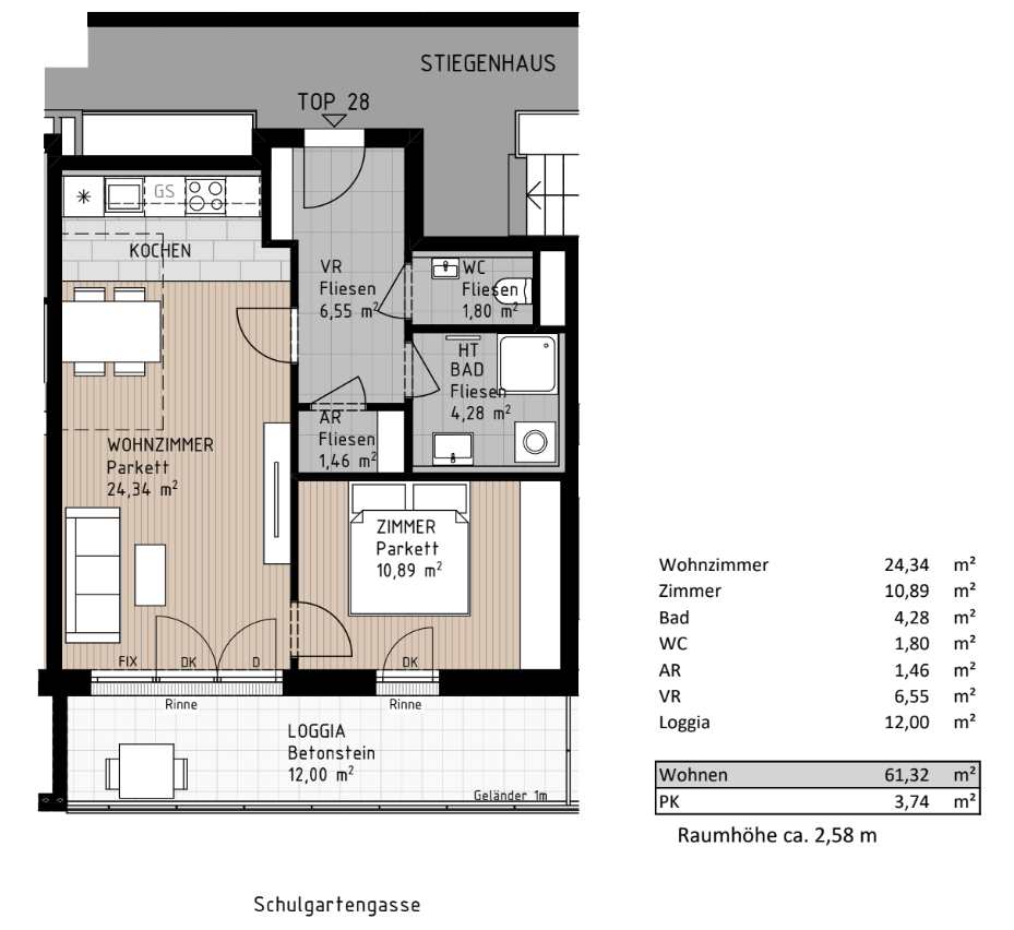 TOP 28 im 2. OG mit ca. 61,32 m² Wohnfläche: Wohnküche, 1 Zimmer, Bad, separates WC, Abstellraum und Vorraum. Highlight ist die Loggia mit ca. 12,00 m². Raumhöhe ca. 2,58 m.