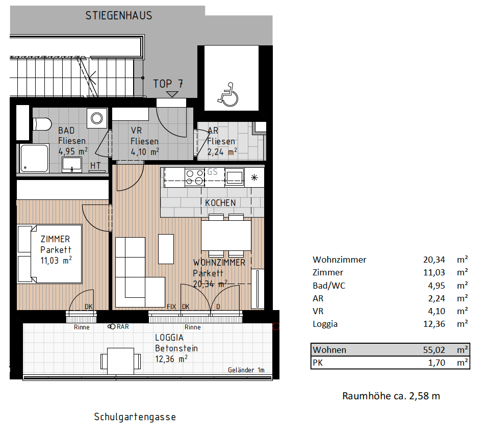 Top 7 im 1. OG mit ca. 55,02 m² Wohnfläche: Wohnzimmer (20,34 m²), Zimmer (11,03 m²), Bad/WC (4,95 m²), Abstellraum (2,24 m²) und Vorraum (4,10 m²). Highlight ist die Loggia mit ca. 12,36 m². Raumhöhe ca. 2,58 m.